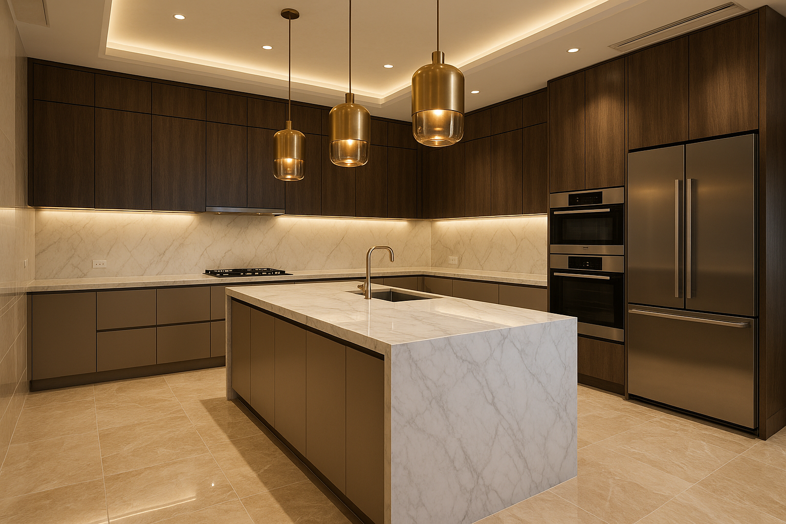 Island Kitchen: Perfect for duplexes and luxury homes—adds extra counter and dining space.