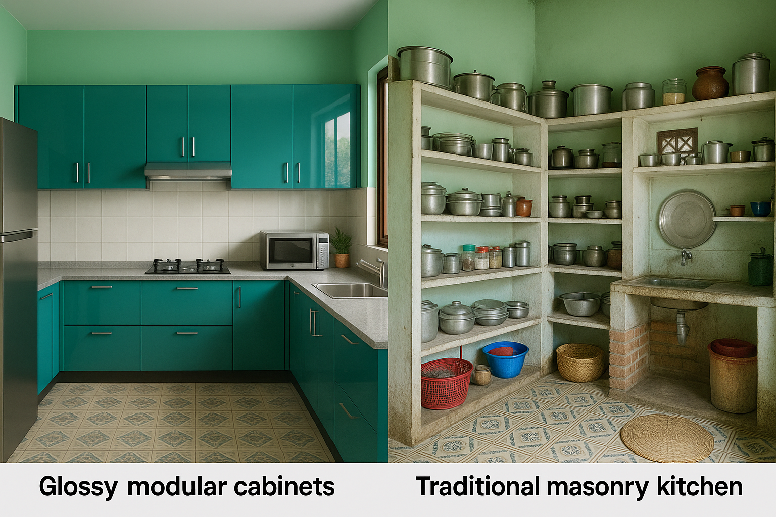 In Bangladesh, traditional kitchens are masonry-based with fixed shelves. They often lack flexibility. Modular kitchens, on the other hand, use factory-made cabinets and can be customized for any layout.