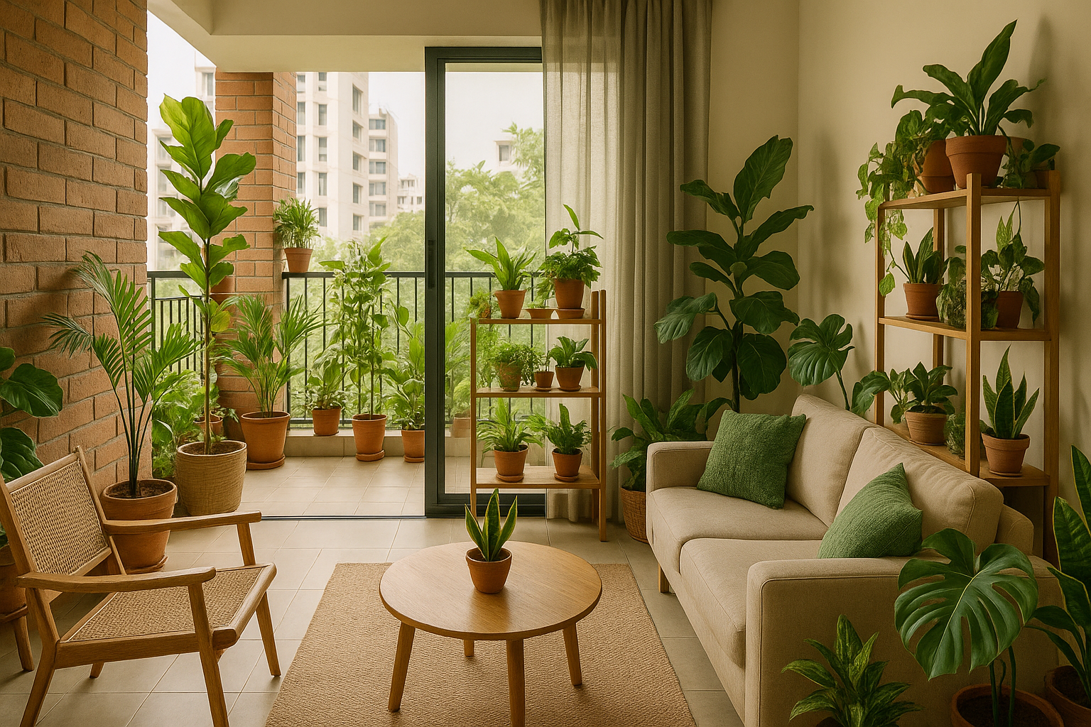 Placing plants near windows, balconies, and living rooms creates a calming atmosphere.