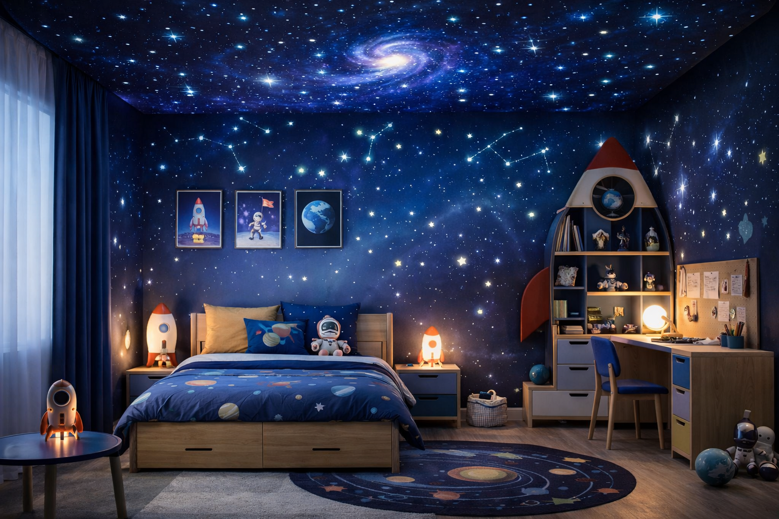 Glow in the dark stars, rocket lamps, galaxy wallpapers.
